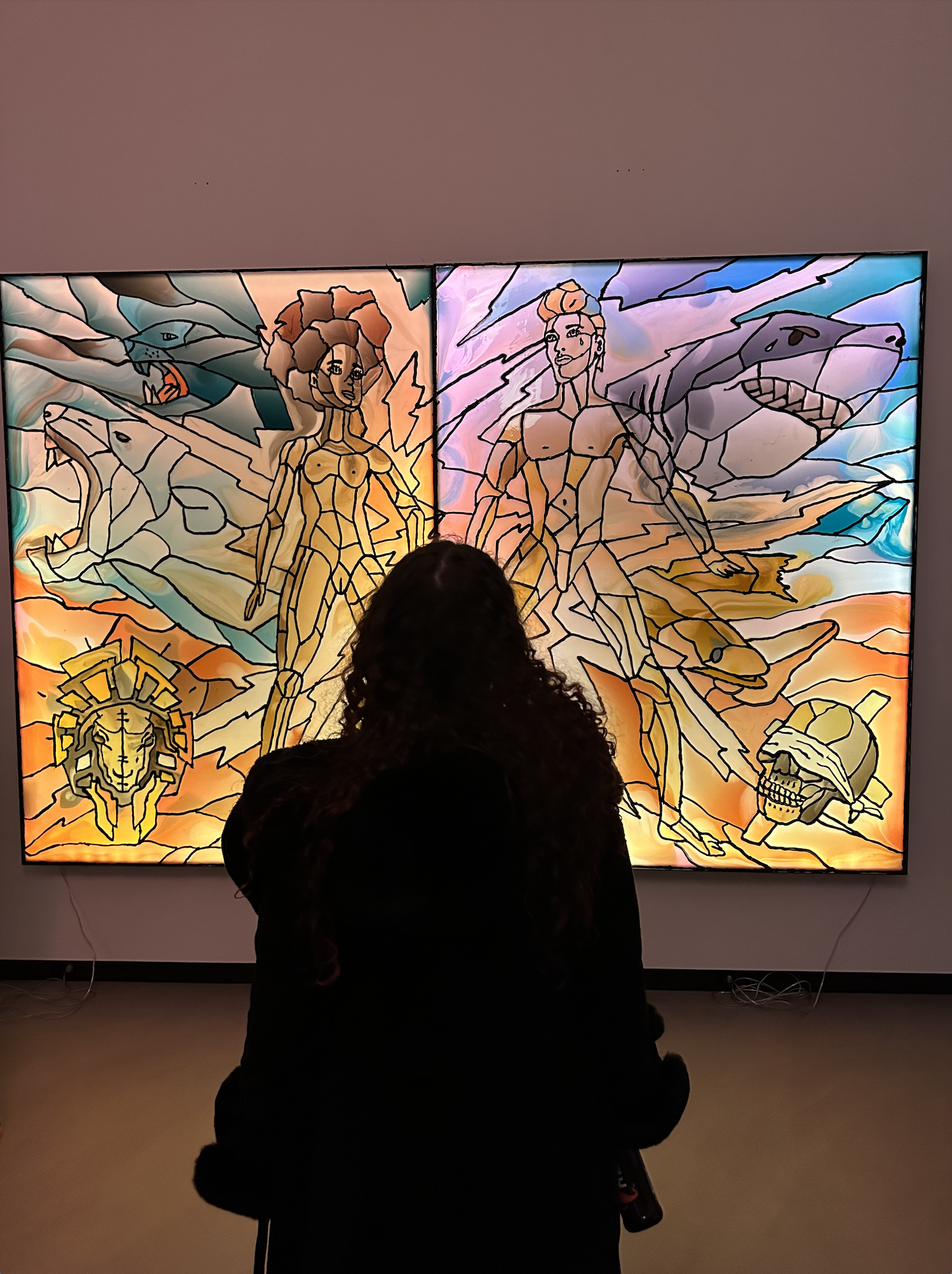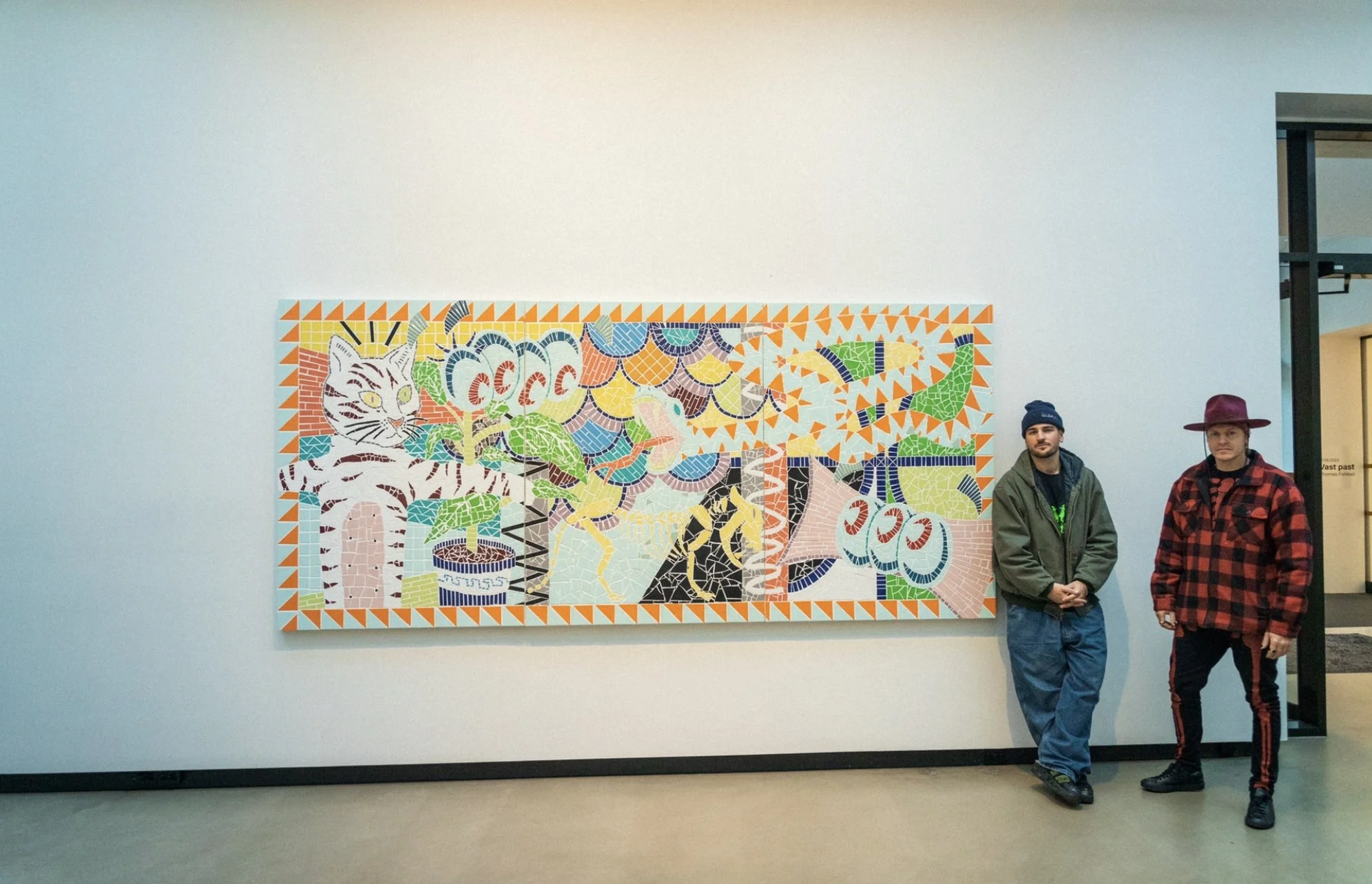 The exhibition at K-U-K presents new light works, as well as the mosaic piece Domestic Struggles — a 3.8-meter-wide work weighing several hundred kilograms. The piece was created in collaboration with Julius Karoubi.