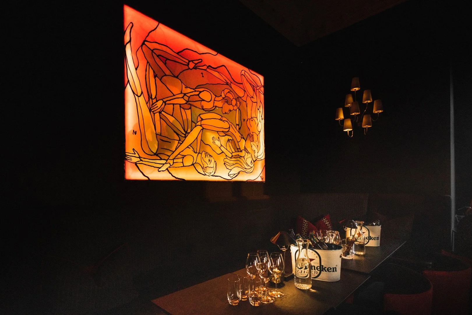 The installation consists of one large-scale relief, five light works, and a monumental chandelier — together forming a unified artistic experience. Each work is tailored to the room in which it is installed, engaging with the architecture, materiality, and lighting conditions. The result is a sensual and immersive journey that invites the viewer into a charged and sexually charged exploratory universe.